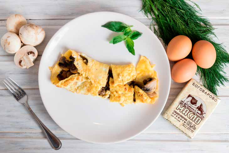 Вкусный и сытный омлет с шампиньонами на завтрак и на ужин. Блюдо получается лёгким и быстрым в приготовлении.