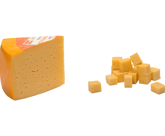 Сыр "Костромской", так хорошо известный в каждом доме на территории России и постсоветского пространства. Сыр изготавливается из пастеризованного коровьего молока с внесением молокосвертывающего сычужного фермента и закваски мезофильных молочнокислых бактерий. Этот полутвердый сыр с небольшим количеством натуральных глазков ровной округлой формы (образующихся в результате деятельности газообразующих молочнокислых бактерий), отличающийся эластичной текстурой и кислосливочным вкусом с легкой пикантностью. Этот сыр хорошо плавится и подходит как для бутербродов, так и для различных блюд.